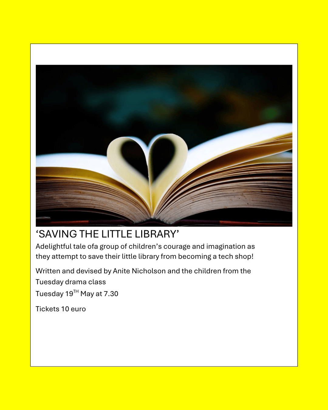 Saving the Little Library Tuesday 19 May, 7.30pm€10 A Delightful tale of a group of children’s courage and imagination as they attempt to save their little library from becoming a tech shop!Written and devised by Anita Nicholson and the children from the Tuesday drama class BOOK NOW BOOK NOW